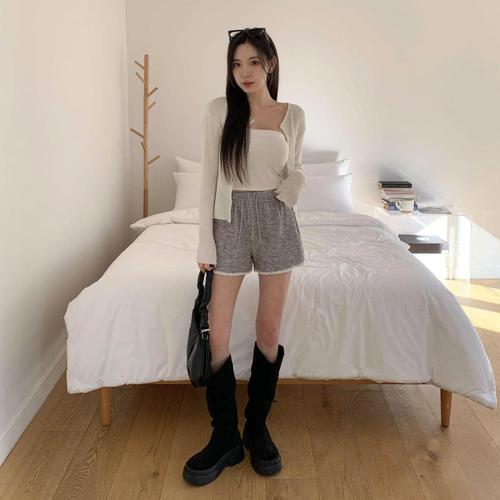 [옷자락] 여자 루즈핏 밑단 레이스 니트 밴딩 반바지