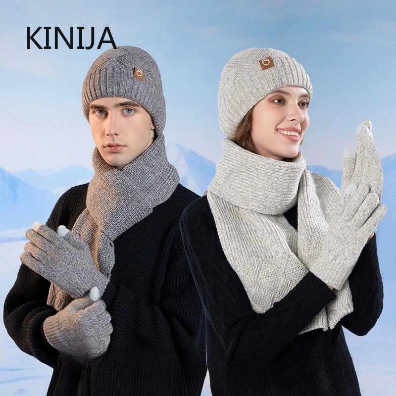 3Pcs 남자 여자 방풍 겨울 모자 야외 겨울 스카프 장갑 캐시미어 절연 니트 모자 비니 모자 여성 스카프