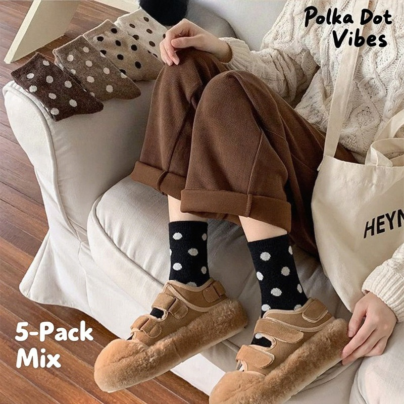 TEMU 가을 겨울 스위트 바이브, 여성용 혼합 컬러 미드 캐프 트렌디 양말 5켤레, 귀여운 도트 프린트, 대학생 스타일 두꺼운 따뜻한 다용도 눈길 잡는 양말