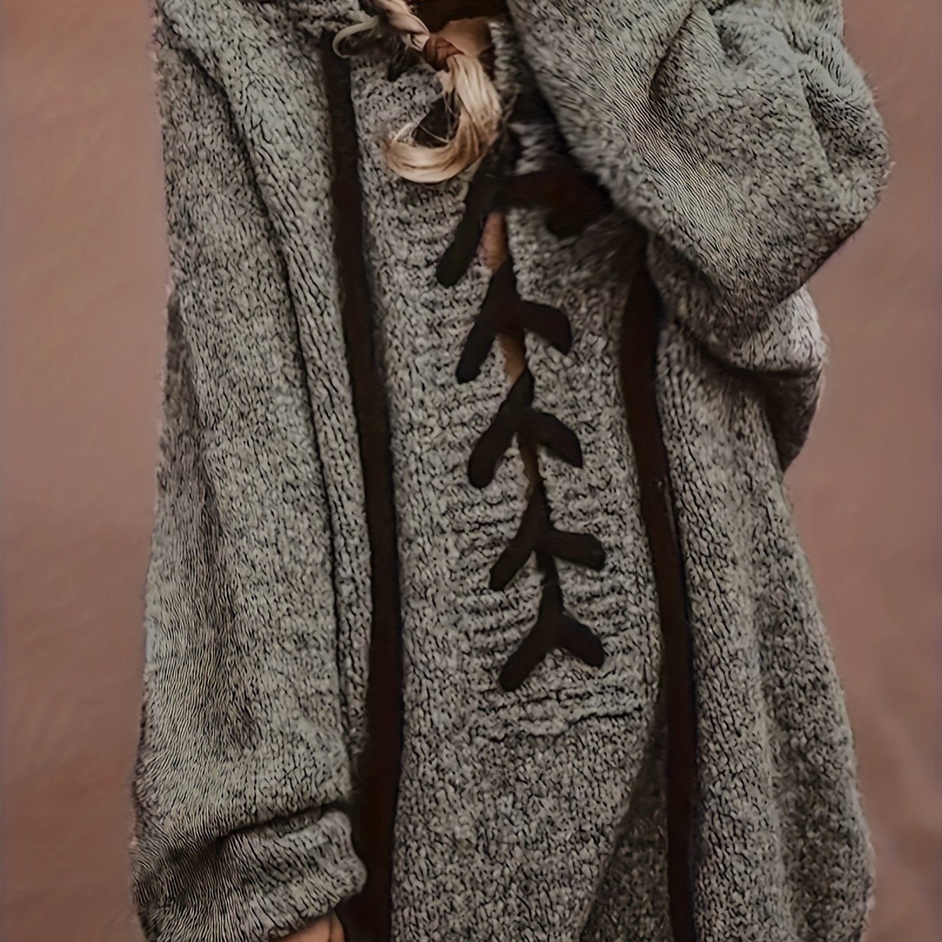 TEMU 케이블 니트 레이스업 V넥 카디건, 가을 & 겨울을 위한 캐주얼 롱슬리브 루즈 카디건, 여성 의류