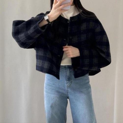 [신상오픈런]여성 클래식 체크 울 라운드넥 투웨이 숏 재킷