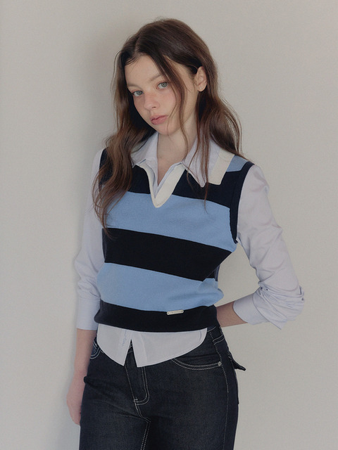 [트위] 컬틴 카라 스트라이프 배색 슬리브리스 니트