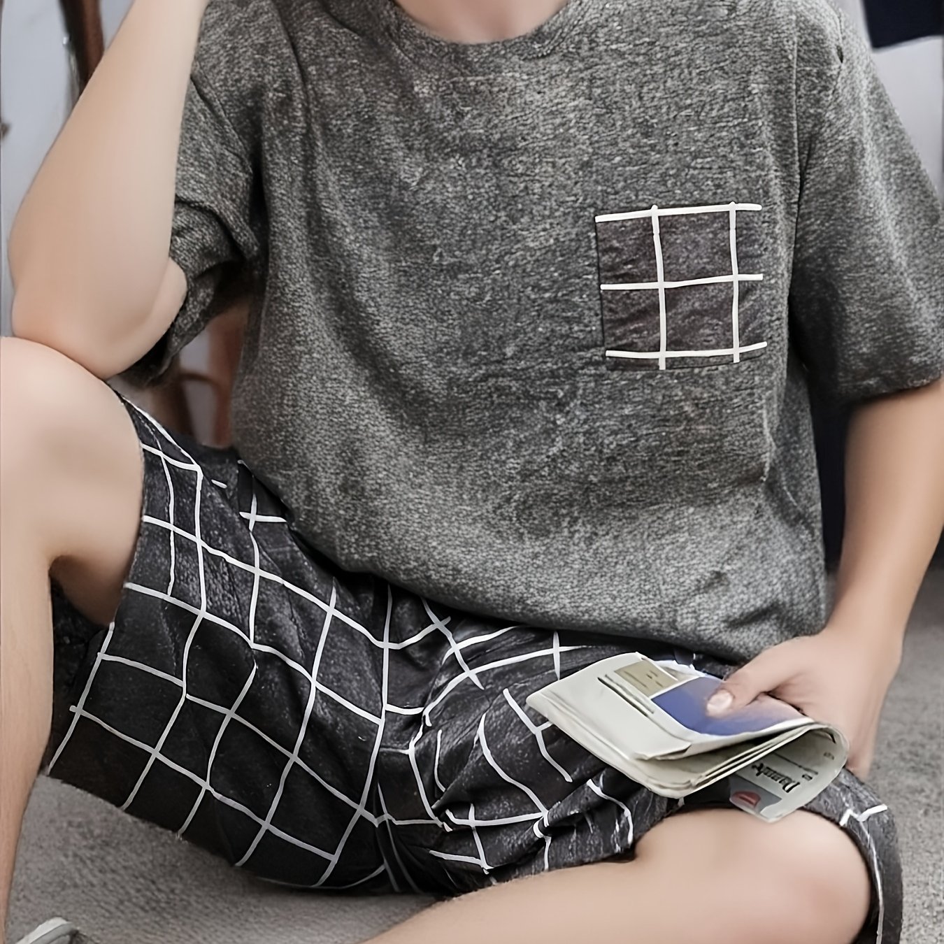 TEMU 남성 여름용 이지 라운드넥 반팔 & 반바지 솔리드 그레이 잠옷 세트 (블랙 체크무늬 바지 포함), 편안하고 캐주얼한 착용감을 위해 디자인됨