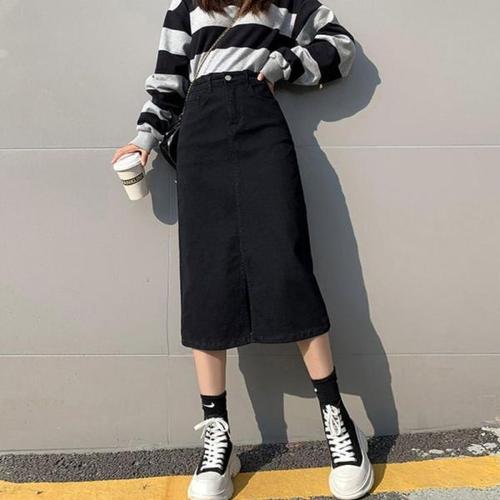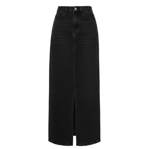 Kdragon 여성 H라인 데님 롱 스커트 앞트임 캐주얼 데일리룩