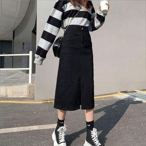 [에이치플러스몰]여성 앞트임 슬릿 데님 롱스커트 H라인 청치마 롱기장 3색