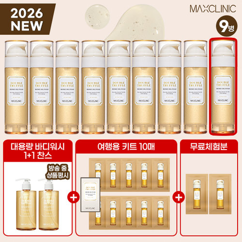 [10%할인/방송에서만] 맥스클리닉 더블트러플 바이옴 오일폼 방송패키지 (오일폼 110g x 9 + 여행용 파우치 10매 + 무료체험 2매 + 오일 바디 워시 300g)