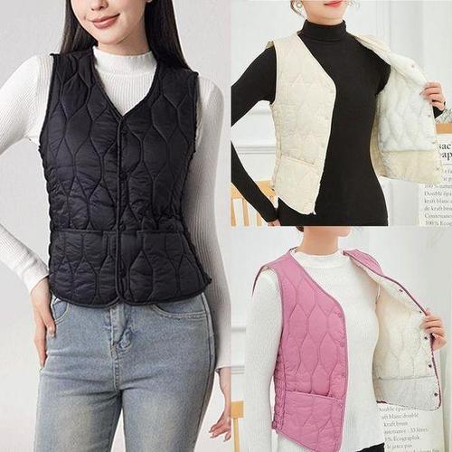 1+1 가을 겨울 패딩 브이넥 조끼 도톰한 기모 슬림핏 램스울 보온 베스트 여성용 학생 포근한 민소매 상의