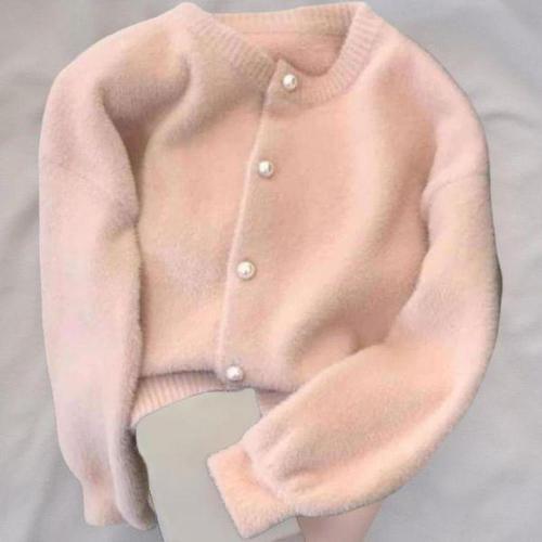 [신상오픈런]여성 진주 버튼 포인트 라운드넥 퍼 카디건