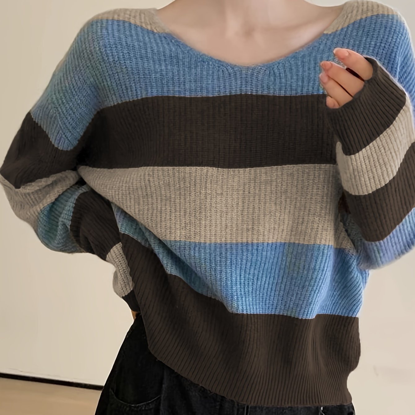 TEMU 여성용 가을 스웨터, 패셔너블 가을 컬러 블록 V넥 긴팔 니트 풀오버, 새로운 겨울 루즈 캐주얼 다용도 레이지 드레이프 탑