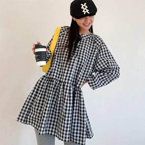 |CSO596D|여성 체크 패턴 블랙 퍼프 소매 플레어 미니 드레스