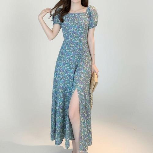 |CCO59A5|여성 스퀘어넥 퍼프 소매 앞트임 플레어 롱 드레스