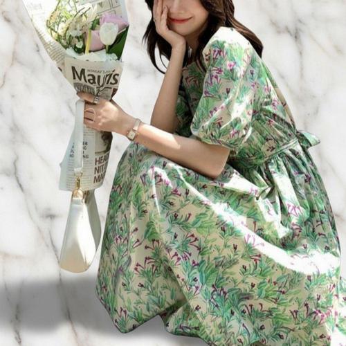 |CCO5949|여성용 봄 여름 일상복 꽃무늬 퍼프 소매 미디 드레스