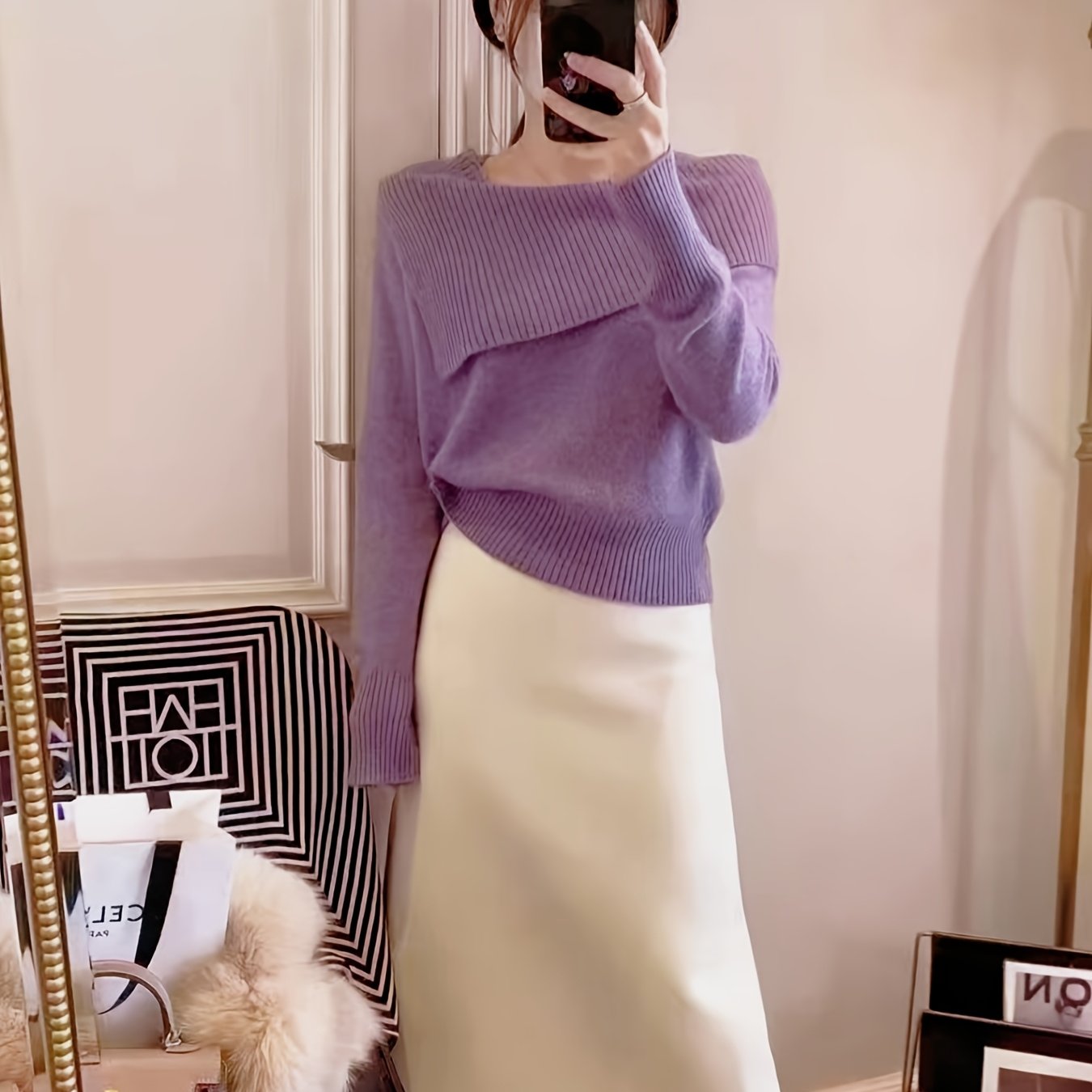 TEMU 여성용 우아한 오프숄더 칼라 탑 - 베이스 레이어 블라우스, 미디엄 스트레치 솔리드 컬러 롱 슬리브 셔츠, 캐주얼 또는 드레시한 옷차림에 적합한 봄/가을 레이어링 아이템, 세탁기 사용 가능