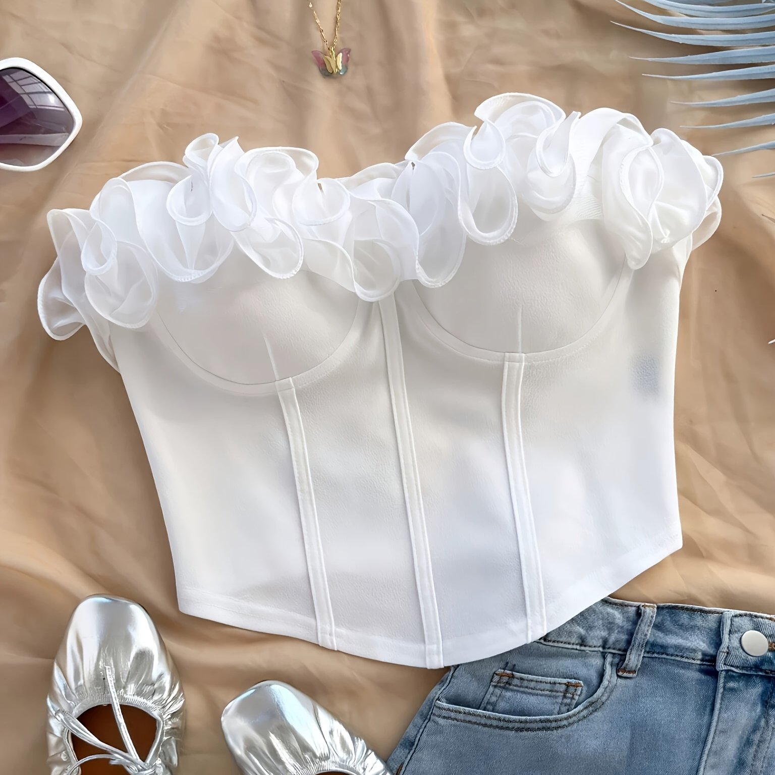TEMU 여성용 셔폰 레이스 트림 단색 섹시한 어깨 없는 크롭 탑, 패션적인 오프숄더 디자인, 봄/여름/가을용 짧은 블라우스|여름블라우스
