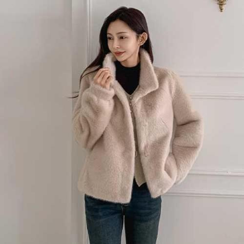 PDS패션 여성용 밍크 퍼 숏 스탠드 컬러 플러시 자켓