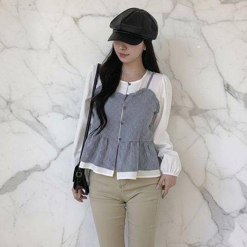 [신상오픈런]여성 체크 패턴 페플럼 뷔스티에 레이어드 블라우스