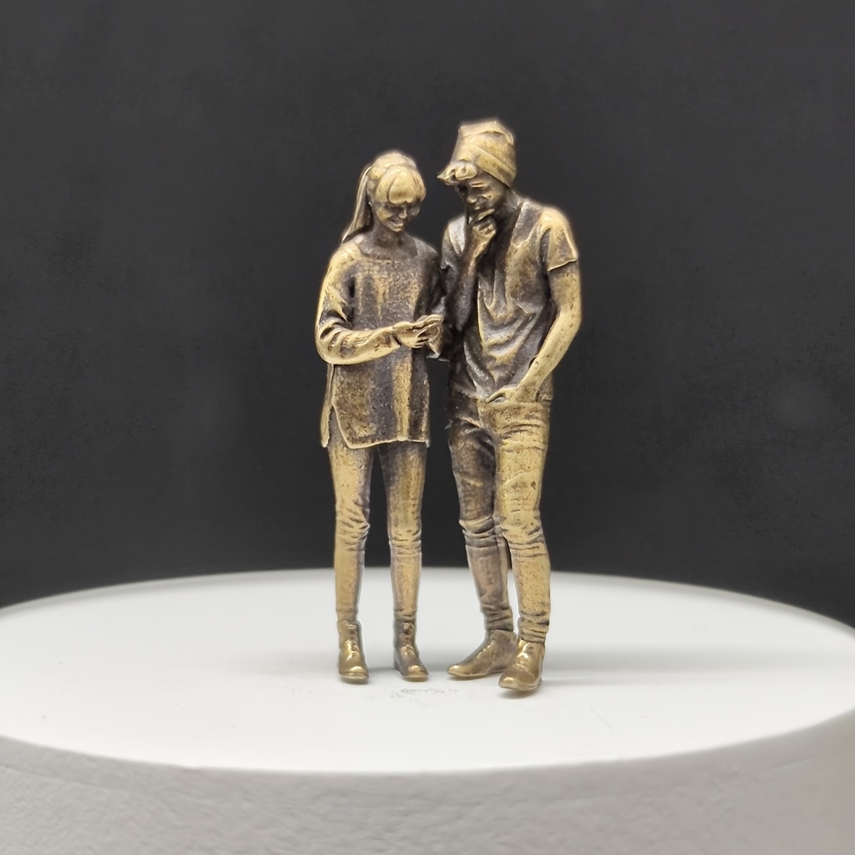 TEMU 모던 커플이 스마트폰을 사용하는 브라스 미니어처 풍경 세트, 촬영 장면 구성용 피규어 및 차량 모델, 창의적인 수집품 및 디스플레이 아이템.