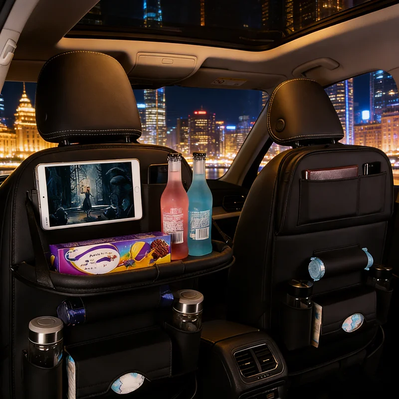 자동차 시트 뒷면 정리함 PU 가죽 접이식 테이블 트레이 수납 포켓 및 킥 매트 포함 - 차량 내부 액세서리