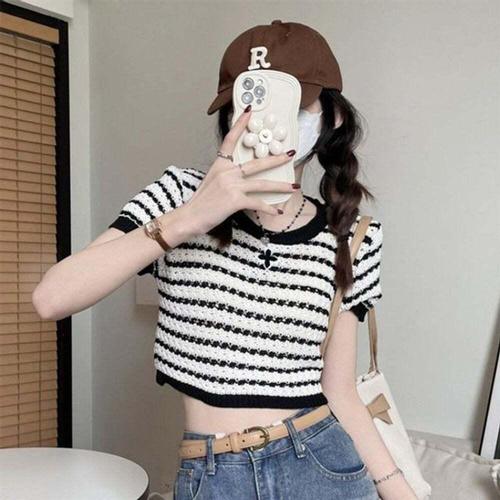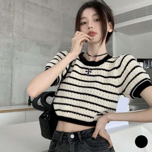 [셀럽하우스]꽃잎브로치 BJED8662 포인트 러블리 시원한 줄무늬 크롭니트