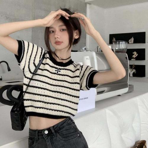 [셀럽하우스]꽃잎브로치 DPSL6751 포인트 러블리 시원한 줄무늬 크롭니트