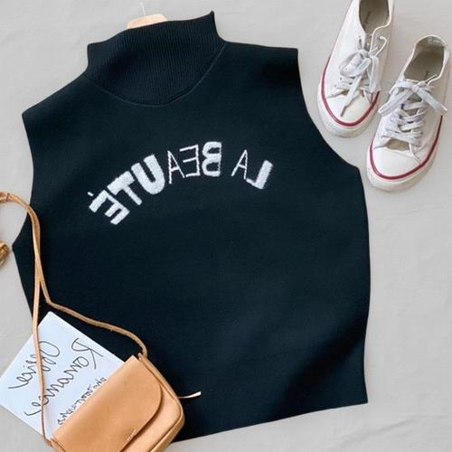 [미라클세븐]여성 힙무드 레터링 시보리 폴라 민소매 니트