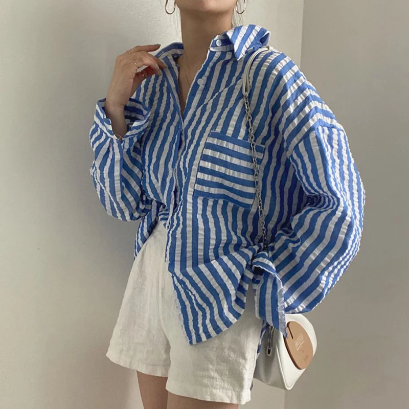 시크한 초가을 루즈핏 텍스처 긴팔 폴로 칼라 컬러 블록 스트라이프 싱글 버튼 여성 셔츠 다용도 캐주얼 탑