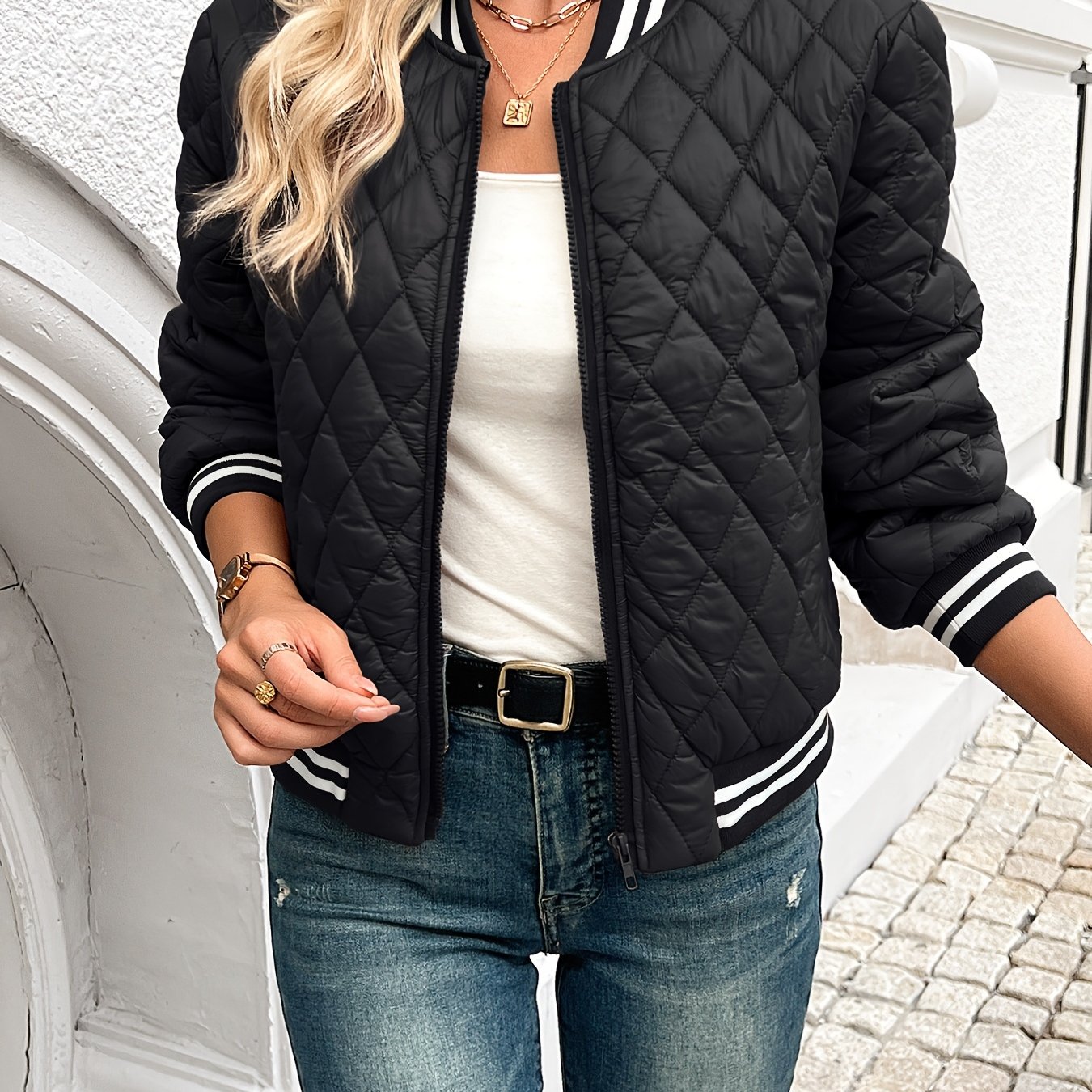 TEMU 여성 빈티지 아메리칸 스타일 퀼팅 재킷, 지퍼형 가을/겨울용, 야구 점퍼.