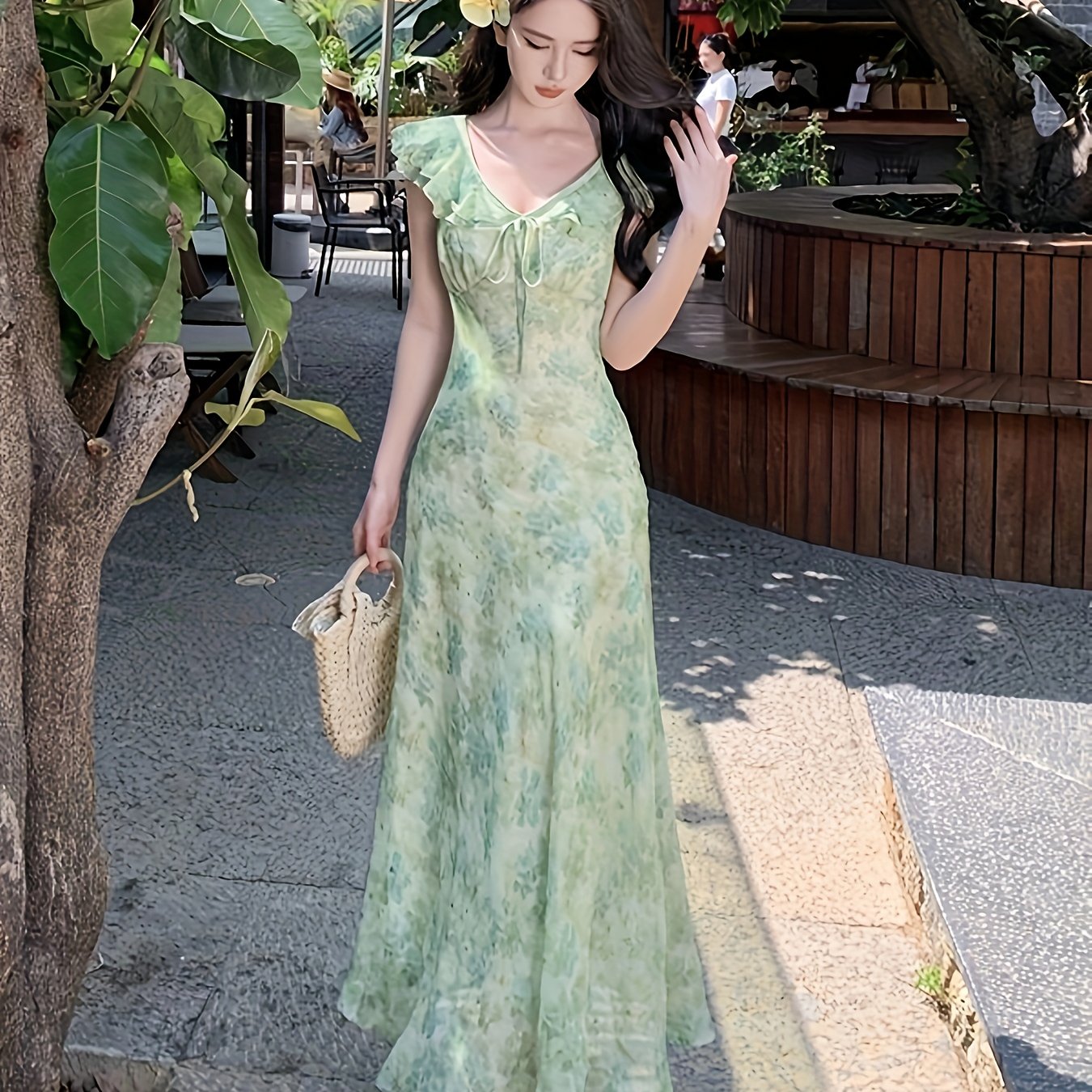 TEMU 여성용 우아한 플로럴 비치 드레스 - 민트 그린 꽃무늬, A라인 정장 & 캐주얼 의상, 웨딩, 파티, 휴가용 - 가벼운 여름 드레스, 끈 조절 허리, 오프숄더 넥라인, 부드러운 원단 가운