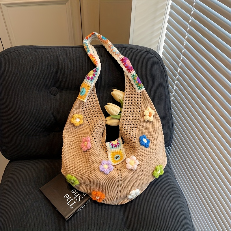 TEMU 새 여성용 토트백 대용량 숄더 니트 가방 패션 꽃 토트백 소형 프레쉬 핸드메이드 코바늘 뜨개질 가방 여성