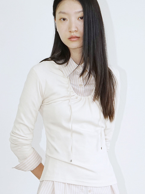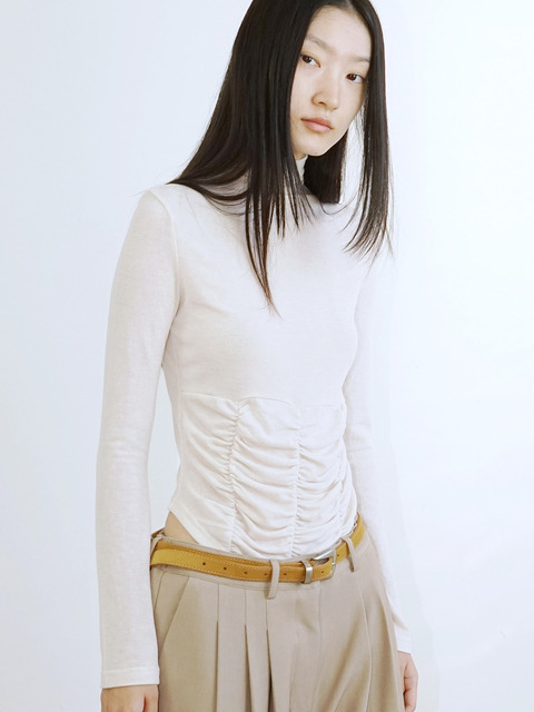 [프로보] 허리 셔링 목폴라 슬리브 티셔츠 / 베이지