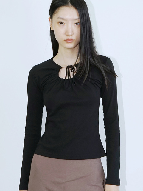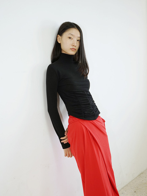 [프로보] 허리 셔링 목폴라 슬리브 티셔츠 / 블랙