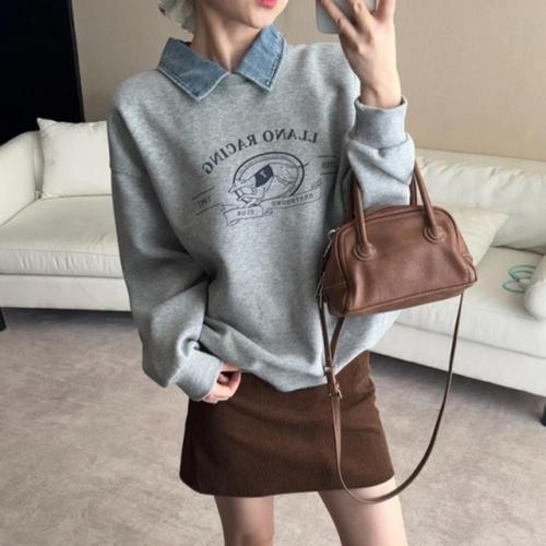 [옷자락] 여자 데님카라 포인트 프린팅 오버핏 맨투맨