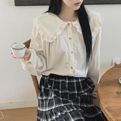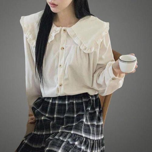 [다잇템][다잇템] 여성 프릴 빅카라넥 면원단 귀여운 골덴 블라우스_23771291_588872