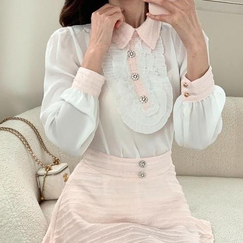 [신상오픈런]여자 플리츠 프릴 큐빅 배색카라 시스루 여리 블라우스