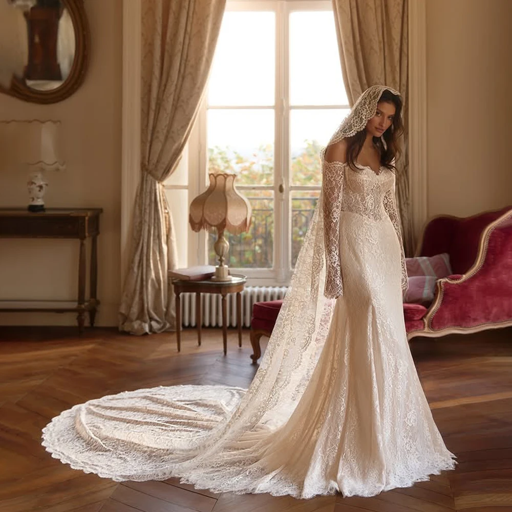 BEBEKEY 여성용 긴 소매 레이스 웨딩 드레스 스쿠프 넥 채플 트레인 머메이드 가운 웨딩 파티 로브