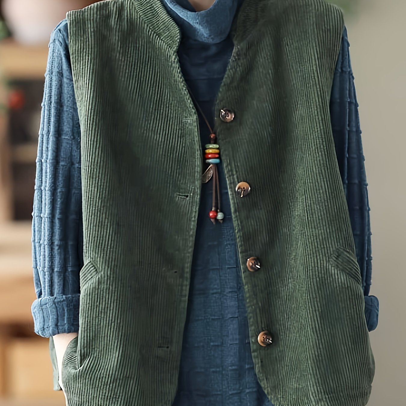TEMU 여성용 빈티지 민소매 조끼, 앞면 포켓 포함 - 캐주얼 더블 포켓 디자인, 봄 & 가을용 브라운 V넥 스웨터 조끼, 캐주얼 의상 | 레트로 스타일