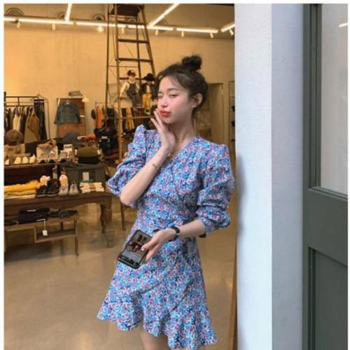 [JHQSYDFE_51IB]여성 프릴소매 플라워 셔링 A라인 랩원피스