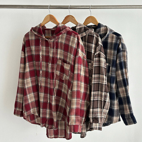 [옷자락] 여성 루즈핏 체크 플란넬 후드 남방 포켓 셔츠