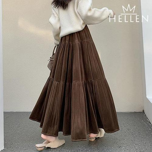[헬렌]헬렌 벨벳 플레어 롱 스커트 치마 플리츠 가을 겨울
