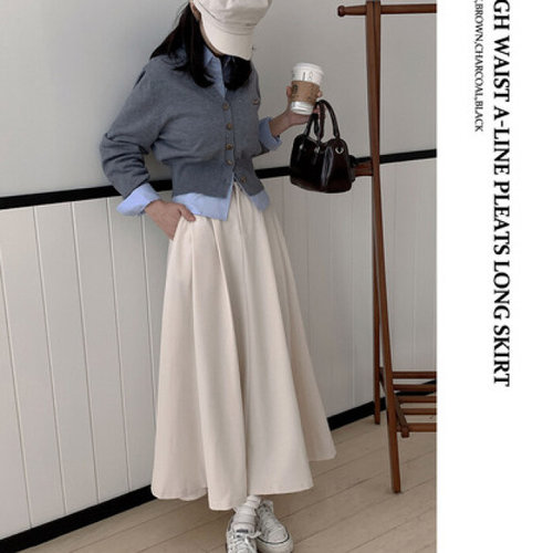 [에이치플러스몰]밴드라인 새틴 롱라인 플리츠 롱스커트플레어스커트 데일리