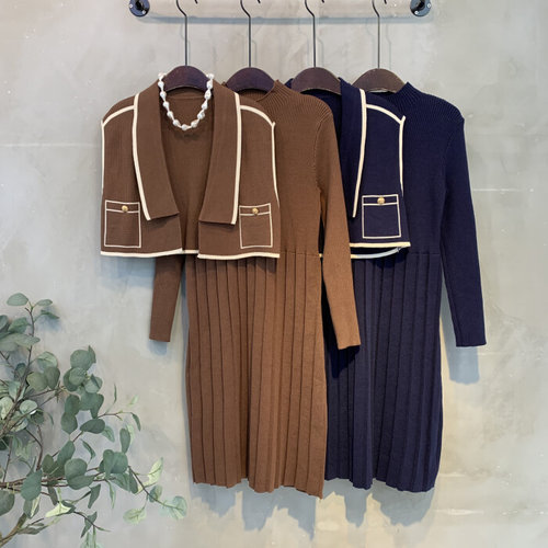 씨샵인더룸 / 몰튼 배색 크롭조끼 플리츠 반폴라 원피스세트 2color