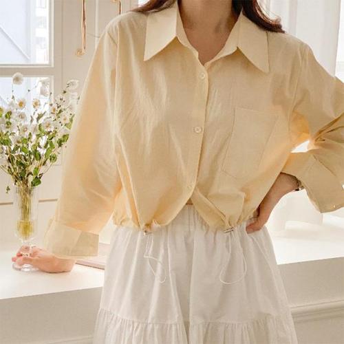 [미라클세븐]여성 베이지 핑크 두 포켓 버튼 라운드넥 긴팔 블라우스