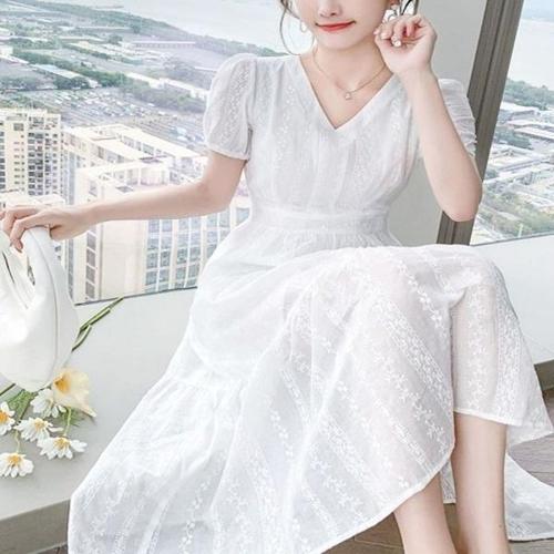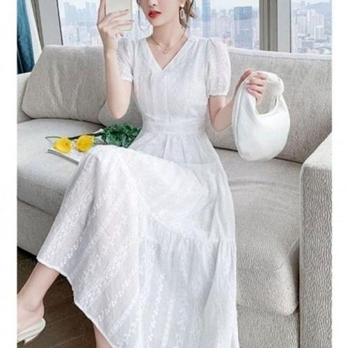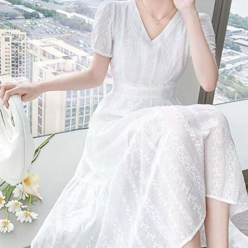 [엄지척]화이트 소매 펀칭 브이넥 여성 롱 플레어 반팔 원피스_19911599_667501
