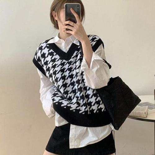 [옷자락]여성 클래식 하운드투스 브이넥 니트 조끼