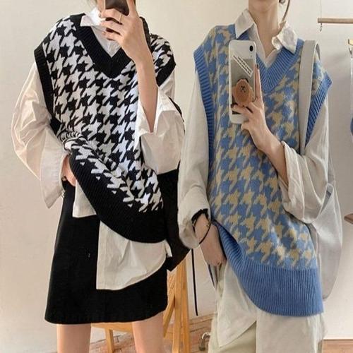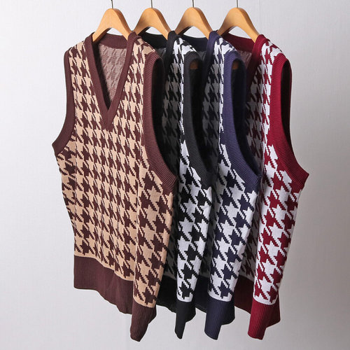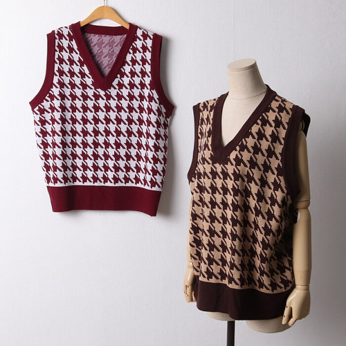 [신상오픈런]여성 브이넥 니트 베스트 하운드체크 패턴
