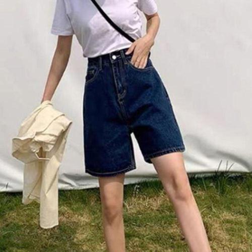 EAMT 여성 바지 청 검정 여름 빅사이즈 배모양 와이드 몸매 반바지 청반바지 날씬한 A라인 하이웨스트 YJ2