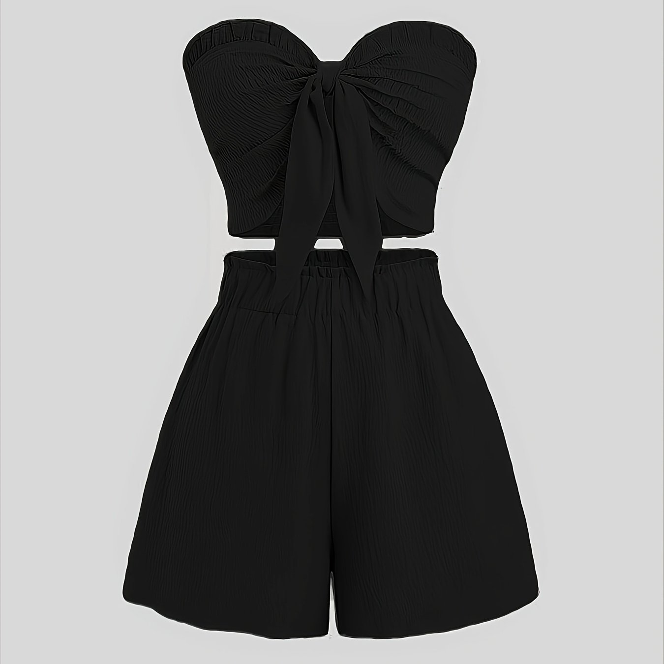 TEMU 심플한 휴가 스타일 로맨틱 비치 데이트 세트: V넥 크롭탑과 밴딩 숏팬츠 여성용 투피스, 다재다능 프렌치 캐주얼 룩, 여성을 위한 비치 아웃핏
