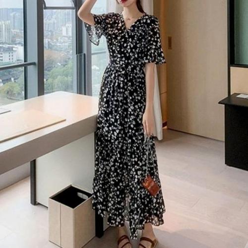 [엄지척]브이넥 랩디자인 하트 패턴 허리 밴딩 반팔 롱원피스_19910475_667501