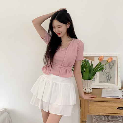 아이언하트 여자 여친 니트 여름 투피스 티 라운드넥 반팔 셔츠 쿨링 세트 상의 KKE2