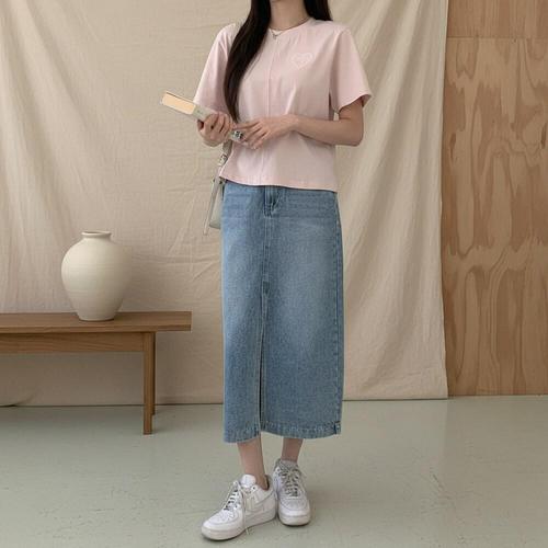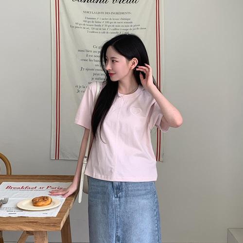 [옷자락] 여성 하트 자수 라운드넥 반팔 티셔츠 남방